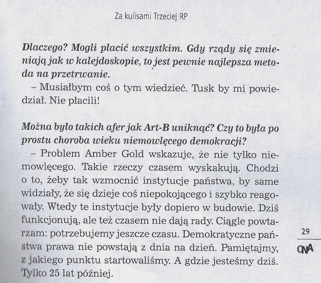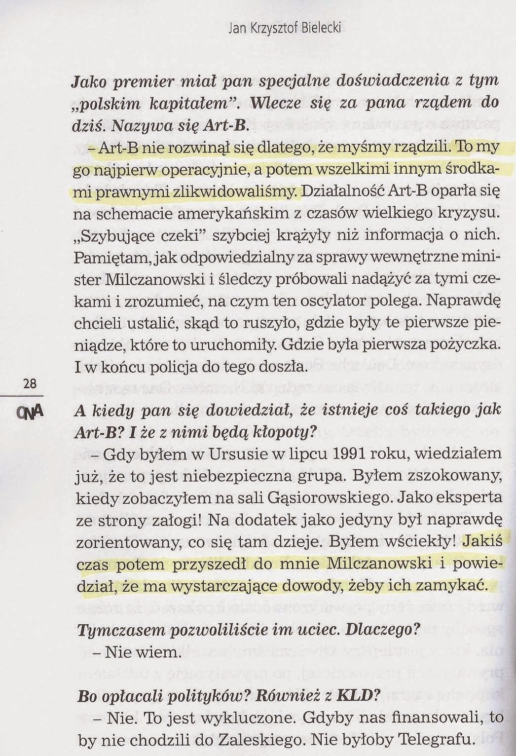 – Art-B nie rozwinął się dlatego, że myśmy rządzili. To my go najpierw operacyjnie, a potem wszelkimi innym środkami prawnymi zlikwidowaliśmy. Działalność Art-B oparła się na schemacie amerykańskim z czasów wielkiego kryzysu. „Szybujące czeki” szybciej krążyły niż informacja o nich. Pamiętam, jak odpowiedzialny za sprawy wewnętrzne minister Milczanowski i śledczy próbowali nadążyć za tymi czekami i zrozumieć, na czym ten oscylator polega. Naprawdę chcieli ustalić, skąd to ruszyło, gdzie były te pierwsze pieniądze, które to uruchomiły. Gdzie była pierwsza pożyczka. I w końcu policja do tego doszła.