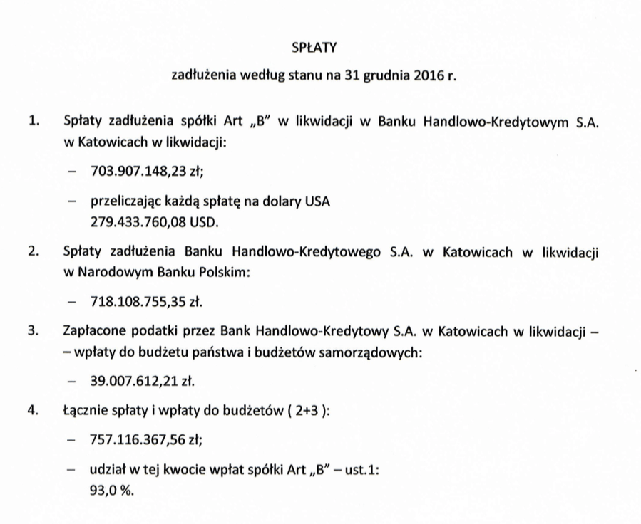 Dokumenty 757 milionów zł z likwidacji Art-B Autor Media Network Intelligence Data 22 października, 2019 • ( Dodaj komentarz ) Saldo spłaty zadłużenia Art-B w likwidacji do NBP i Skarbu Państwa na dzień 31.12.2016: 757 milionów zł (291 milionów dolarów) Udostępnij: Kliknij, aby udostępnić na X (Otwiera się w nowym oknie) X Kliknij, aby udostępnić na Facebooku (Otwiera się w nowym oknie) Facebook Lubię Wczytywanie… Related Kategorie: Dokumenty Tagi: Eksterminacja Art.B