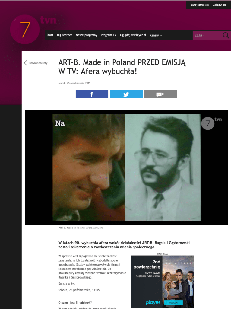 TV ART-B. Made in Poland PRZED EMISJĄ W TV: Afera wybuchła! Autor Media Network Intelligence Data 26 października, 2019 • ( Dodaj komentarz ) Udostępnij: Kliknij, aby udostępnić na X (Otwiera się w nowym oknie) X Kliknij, aby udostępnić na Facebooku (Otwiera się w nowym oknie) Facebook Lubię Wczytywanie… Related Kategorie: TV Tagi: Art.B - Made in Poland