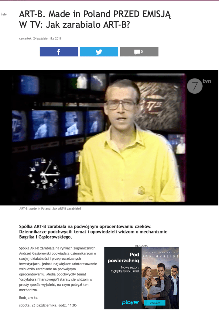 TV ART-B. Made in Poland PRZED EMISJĄ W TV: Jak zarabialo ART-B? Autor Media Network Intelligence Data 26 października, 2019 • ( Dodaj komentarz ) Udostępnij: Kliknij, aby udostępnić na X (Otwiera się w nowym oknie) X Kliknij, aby udostępnić na Facebooku (Otwiera się w nowym oknie) Facebook Lubię Wczytywanie… Related Kategorie: TV Tagi: Art.B - Made in Poland
