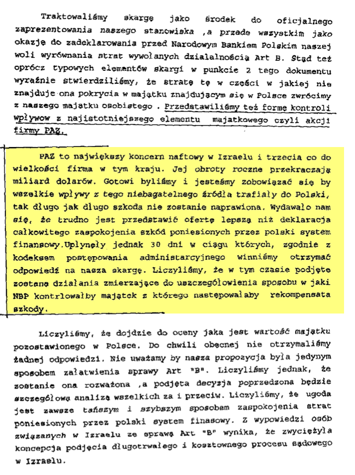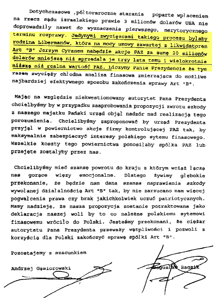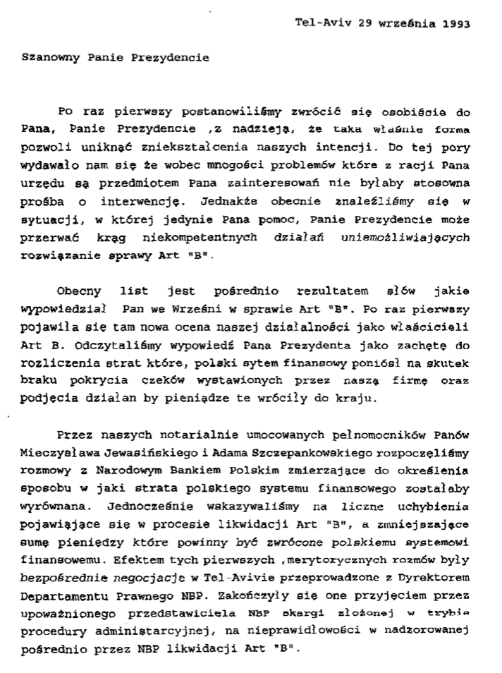 Dokumenty Pismo do Lecha Walesy Autor Media Network Intelligence Data 6 lutego, 2021 29.09.1993 Pismo Andrzeja Gąsiorowskiego i Bogusława Bagsika do Prezydenta Walesy z propozycją przekazania 50% akcji firmy PAZ. Udostępnij: Kliknij, aby udostępnić na X (Otwiera się w nowym oknie) X Kliknij, aby udostępnić na Facebooku (Otwiera się w nowym oknie) Facebook Lubię Wczytywanie… Related Kategorie: Dokumenty Tagi: NBP, PAZ, Walesa